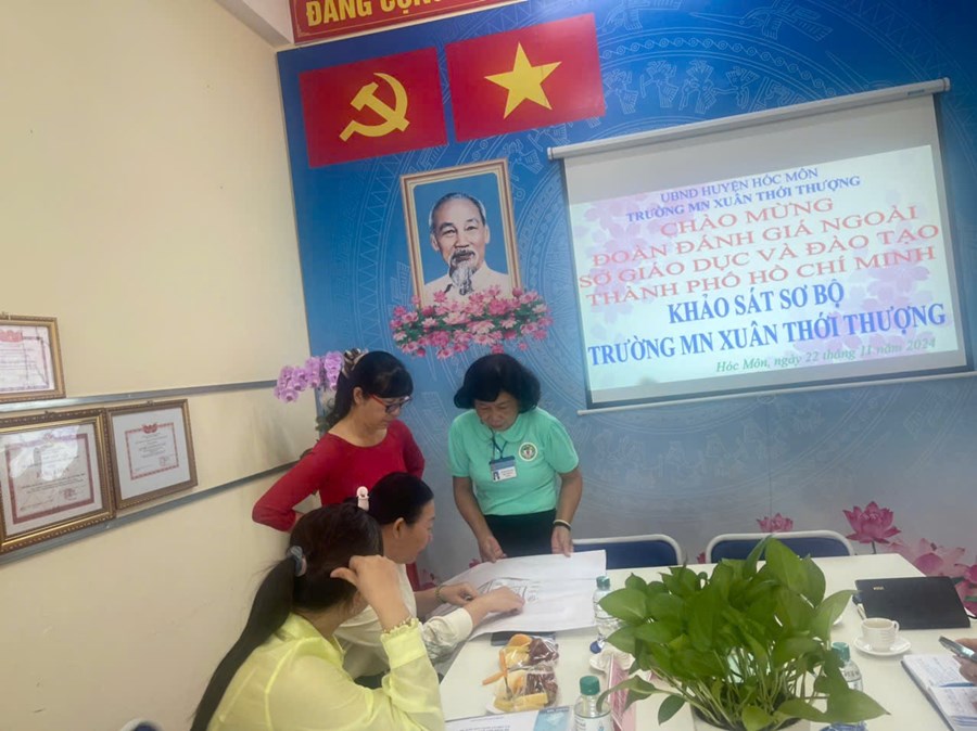 Trường Mầm non Xuân Thới Thượng hân hạnh được đón tiếp bà Lý Mỹ Liên, bà Huỳnh Nguyễn An Thường - chuyên viên Phòng Giáo dục và Đào tạo huyện Hóc Môn, cùng đại diện đoàn đánh giá ngoài Sở Giáo dục và Đào tạo TP.HCM là bà Nguyễn Thị Thuỳ Trang - Trưởng đoàn và bà Thạch Thị Kim Đào - Thư ký đoàn.